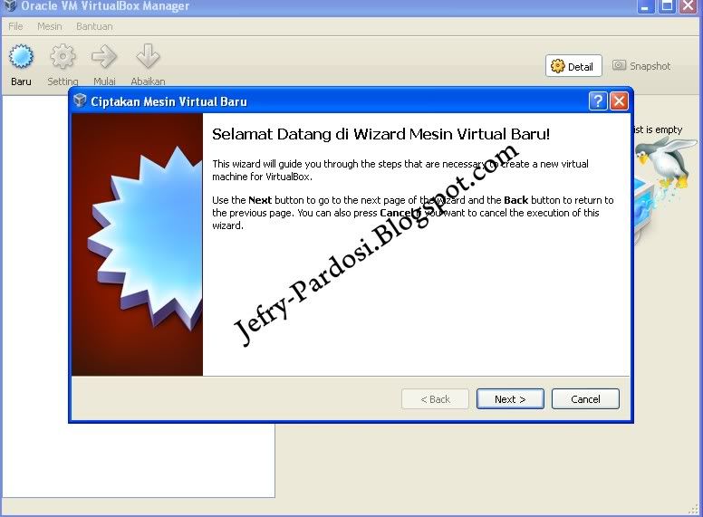 Sekarang tiba saat nya untuk menjalankan VirtualBox, Klik Tombol baru yang ada pada virtualbox,